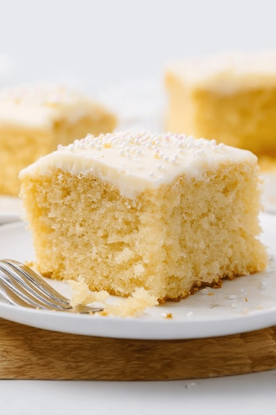 Takes 44 minutes total. Twelve minutes of prep if you’re not rushing. The crumb. Dense but not heavy. Sour cream does that — keeps it tender all the way through without feeling wet. Makes enough to actually eat. Not a tiny sad thing. Feeds people. Works frosted or plain. Almond extract is optional but it’s there. Most vanilla cakes taste like one thing. This one has something else happening in the background. Doesn’t taste like almonds. Just tastes less flat. Stores fine for days. Cold cake is sometimes better than warm cake — sweeter, easier to cut, frosting sets right.