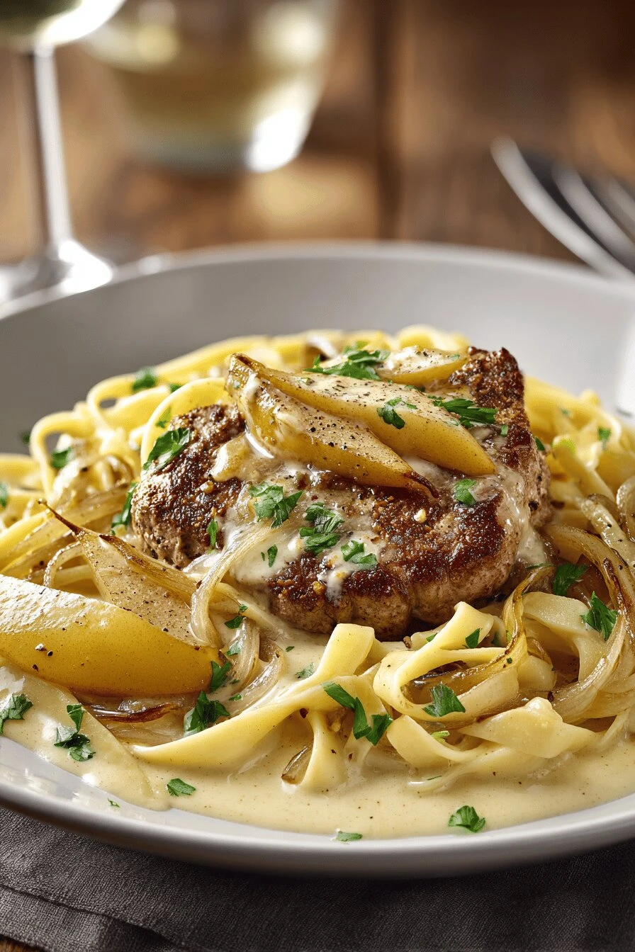 - 6 Nestle fettucine on warm plates thickly, top with cutlets. Spoon pear-onion sauce generously over. Sprinkle fresh parsley for bright end-note and visual lift. Finish with cracked black pepper over all.