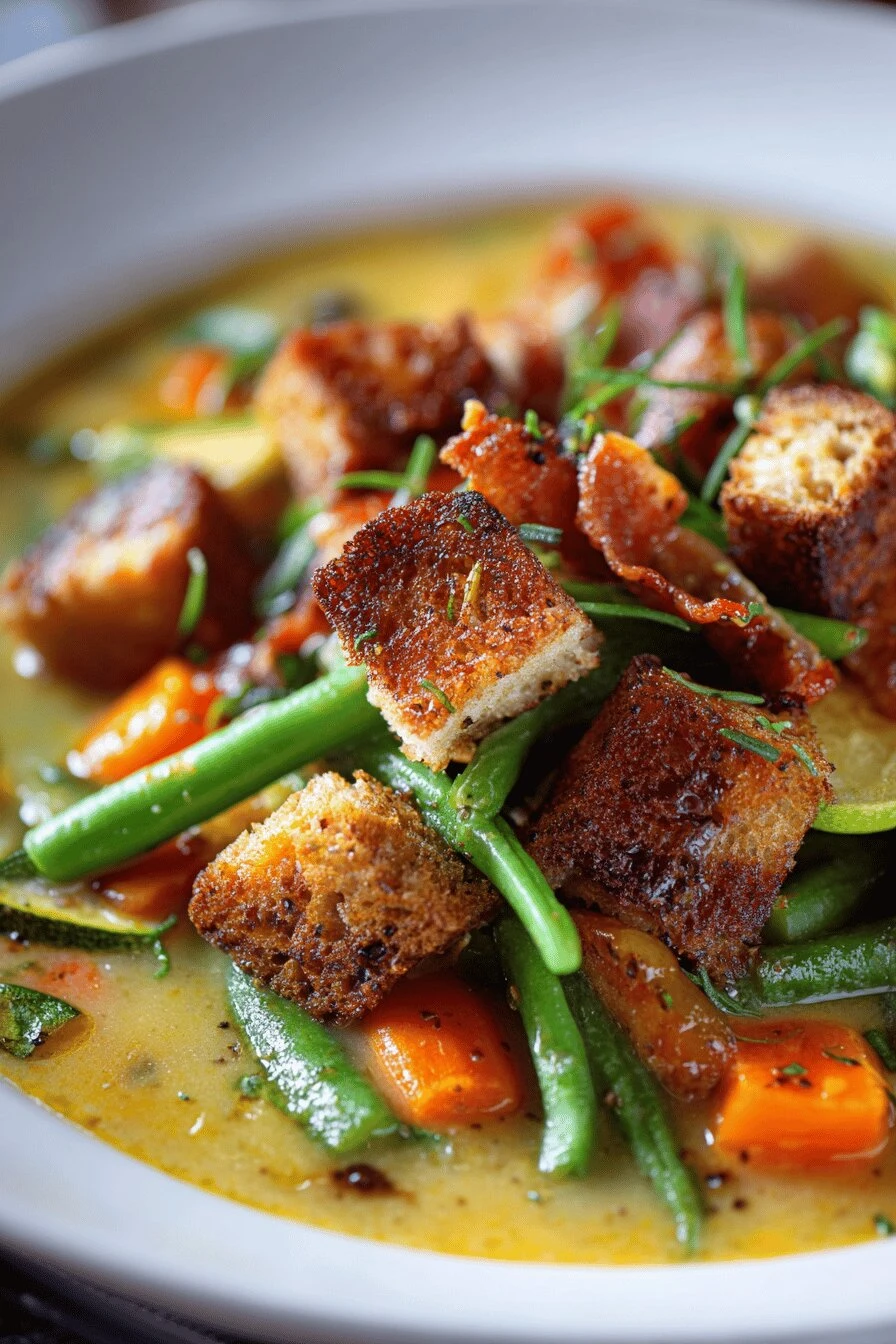 Vegetarian if you swap the chicken stock for vegetable. Works just as well, honestly. The green beans stay bright. The croutons stay crunchy even sitting in the bowl.