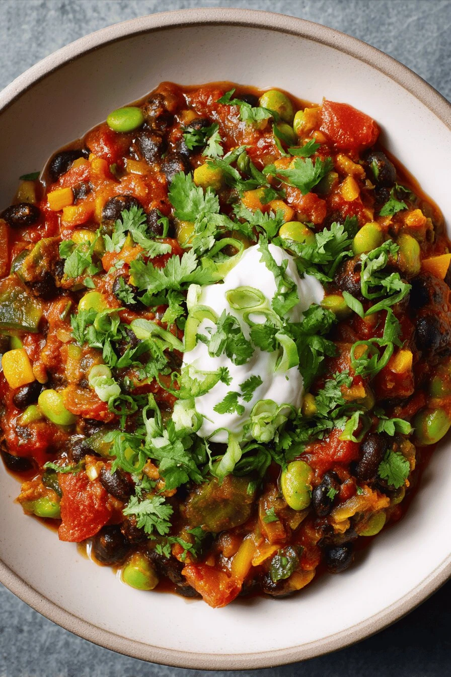 Mixture thickens to chunky stew, juices reducing, veggies soft but snap peas still lively, edamames plump. The smell changes. First it’s sharp, then it mellows, then it smells like actual chili. That’s when you know.