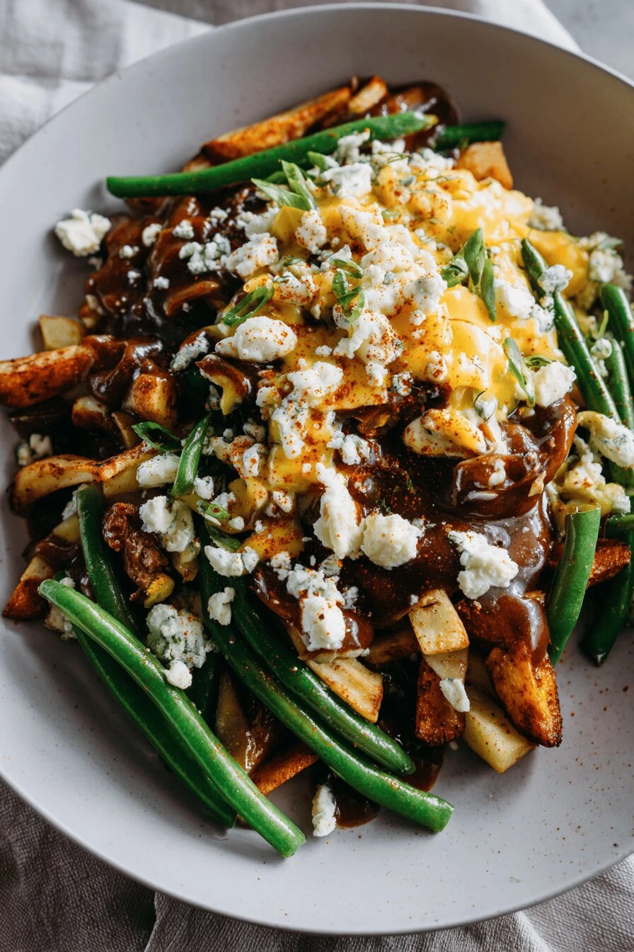 Plate it messy. Deep bowls or shallow ones. Vegetables first. Then scatter the curds and cheddar. Crumble feta on top so it stays visible and salty. Pour the gravy over while it’s hot. If the cheese needs help melting, 3 or 4 minutes in a 200-degree oven. Watch it. Curds just start softening, feta stays crumbly but warm. Serve immediately.
