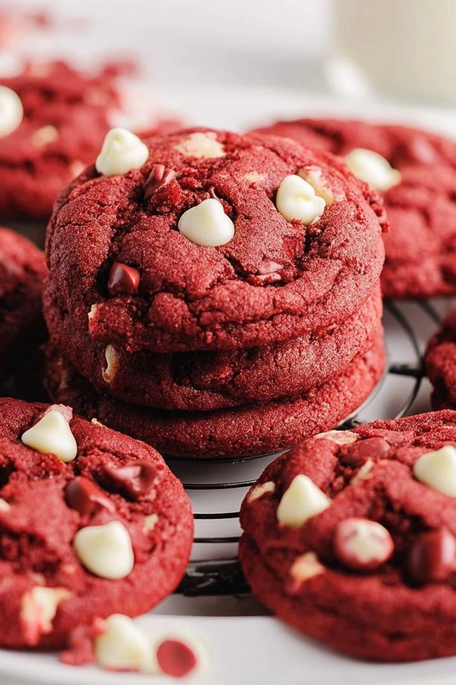 Takes 16 minutes to prep, 10 in the oven. Twenty-six minutes total from counter to cooling rack. Chocolate and white chocolate together — the cocoa powder keeps them from being too sweet, the chips add pockets of cream. The red color stays bright the whole time. Not faded. Not pale pink. Edges crisp, centers soft. That’s the cream of tartar doing its thing. Makes enough to eat three and have leftovers that taste better the next day, which is weird but true.