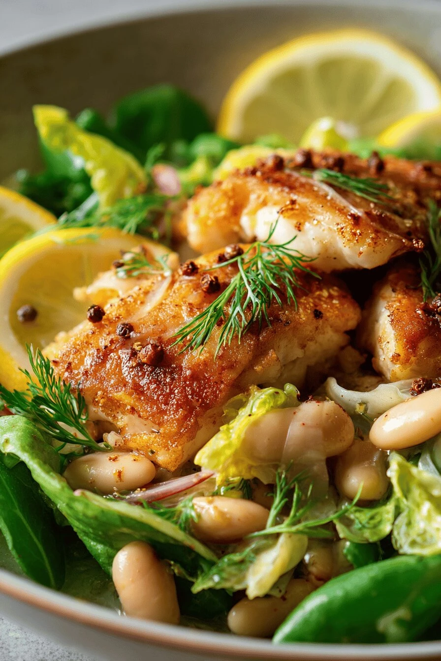 Preheat the basket. Three minutes empty at 205°C. Sounds annoying, but it matters. The fish cooks faster when the basket’s already hot. Don’t flip it. Just leave it. Salt the fish after it’s cooked if you salt it now it draws moisture out. The dressing marinates while the fish cooks—so while you’re waiting those eight minutes, mince the anchovies, chop the herbs, slice the shallot, dump everything with the white beans into the remaining dressing. By the time the haddock comes out, the salad’s ready. Layer it in the bowl—lettuce first, then the marinated beans, then the flaked fish on top. Squeeze lemon over it. The acidity ties everything together.