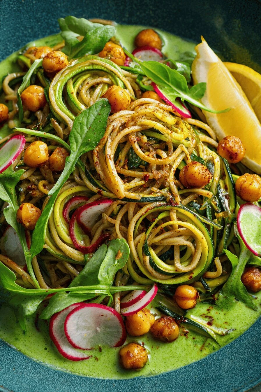 Arrangement matters here more than it sounds. Put the noodles down first. Pile them a bit — doesn’t have to be neat. Layer the zucchini on top. Some overlap is fine. Scatter the warm chickpeas over while they’re still hot. Now the raw stuff. Watercress goes on next — all that peppery green. Then your radish slices. They stay crisp if you don’t dress everything at once. Microgreens last if you’re using them. Just for looks but also they add texture. Lemon wedges on the side. People squeeze as they eat.