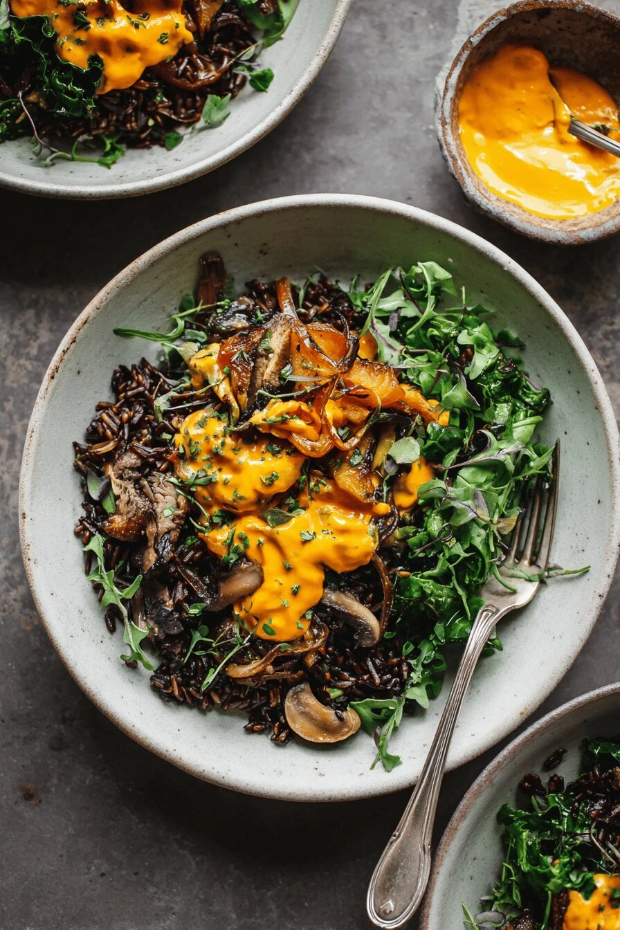 Takes under two hours from start to finish — 50 minutes prep, 55 minutes cooking. Roasted mushrooms hit different when they’re caramelized hard on one side. The orange crema sounds weird but it’s not. Squash gets soft. Rice stays chewy because you rinse it. Duck confit legs are already cooked, so you’re just warming them — fat stays silky, meat falls apart. Spinach or arugula at the end keeps it from feeling heavy. Works as a weeknight dinner or something you’d actually serve people.