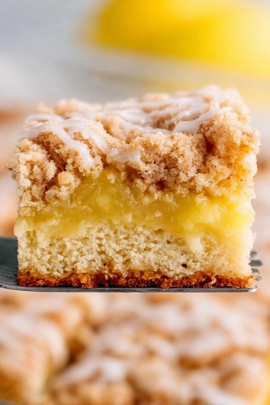 Cream cheese and butter whipped together until they’re basically air. Brown sugar hitting the sizzle. Lemon filling sandwiched between two layers of cake so tender it barely holds itself up. Crumble on top that’s still warm when you cut into it. This is the coffee cake that makes people ask for the recipe while they’re still chewing.