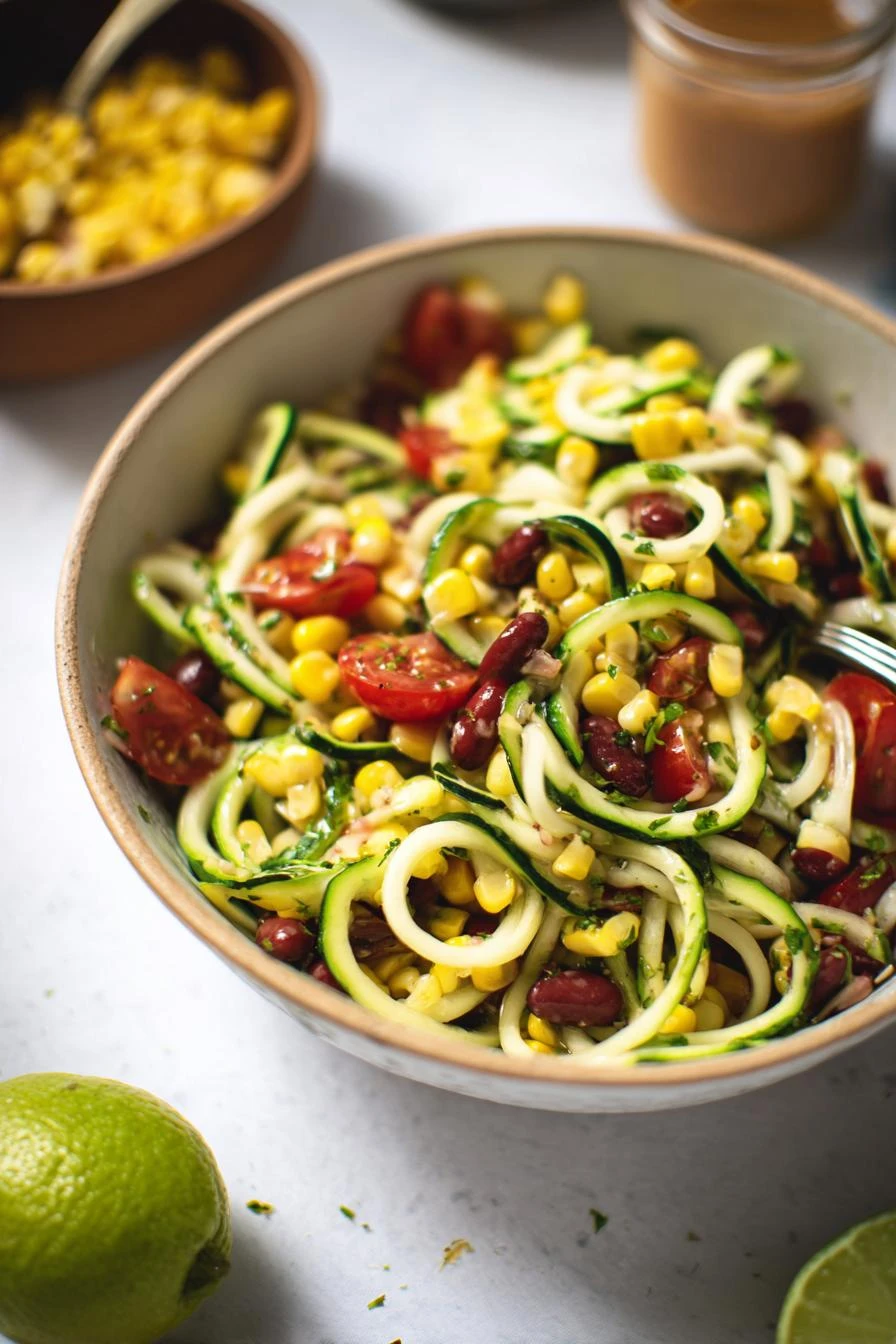 Fresh corn and raw zucchini that actually tastes like something. Not mushy. Not boring. Vegetarian. Healthy without feeling like a punishment. One bowl, maybe 28 minutes total if you don’t overthink it. Cold the next day. Better the next day, actually. Zucchini softens just right. No cooking skills required. Spiralize, sauté corn, mix it. That’s the whole thing. Feta and lime make it taste like you tried harder than you did.