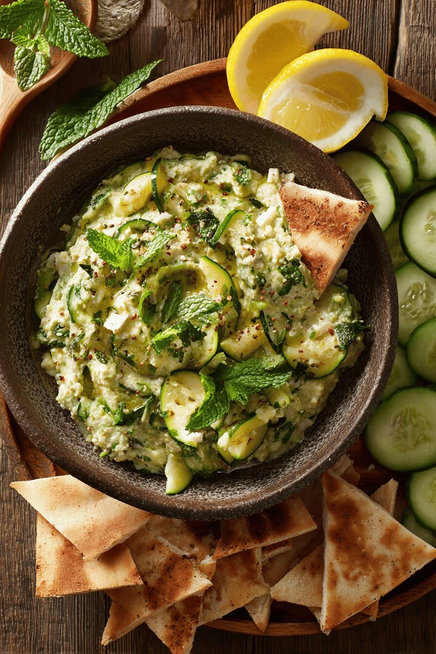 Comes together in 45 minutes. Not fast, but not slow either. Roasted garlic does almost all the work — sweet, soft, nothing sharp about it. Just tastes like time and heat. Works as an appetizer cold from the fridge or room temperature on a board with pita and vegetables. Either way. Mediterranean flavors without actually having to know what that means. Feta. Lemon. Mint. Olive oil. It’s just good. Healthier than most dips. Zucchini’s mostly water (after you squeeze it out), no cream needed, feta gives you salt and tang without heaviness. People eat more of it than they plan to. Tastes better the next day. Flavors settle. Meld. You’ll find yourself making this twice as much as you think you need.